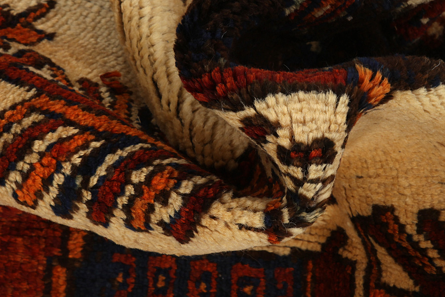 Abrash: Auf Grund des unterschiedlichen Wollfettgehalts und der unterschiedlichen Salzmenge während des Färbungsprozesses, hat die Wolle eine unterschiedliche Farbaufsaugfähigkeit. Vor dem Weben ist es nicht so sichtbar. Aber beim Weben entstehen Reihen mit unterschiedlichen Farbabstufungen der gleichen Farbe. Dies heißt Abrash und verdeutlicht die Natürlichkeit und die Originalität der Wolle, die mit keinen chemischen Mitteln behandelt wurde. Beispiele