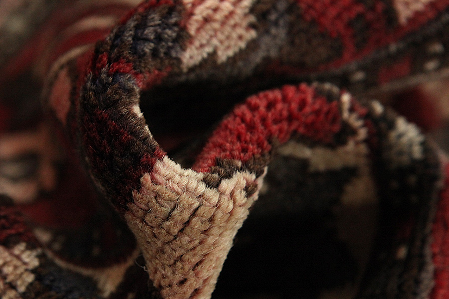 Abrash: Auf Grund des unterschiedlichen Wollfettgehalts und der unterschiedlichen Salzmenge während des Färbungsprozesses, hat die Wolle eine unterschiedliche Farbaufsaugfähigkeit. Vor dem Weben ist es nicht so sichtbar. Aber beim Weben entstehen Reihen mit unterschiedlichen Farbabstufungen der gleichen Farbe. Dies heißt Abrash und verdeutlicht die Natürlichkeit und die Originalität der Wolle, die mit keinen chemischen Mitteln behandelt wurde. Beispiele