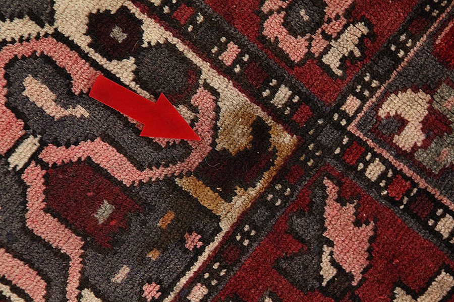 Die Farbe des Teppichs ist an einer kleinen Stelle des Flors verbleicht.