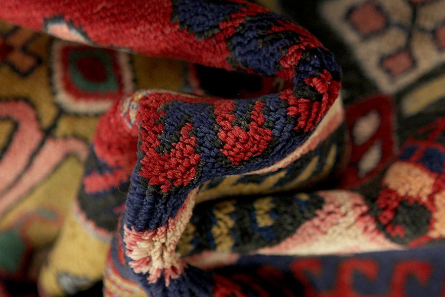 Abrash: Auf Grund des unterschiedlichen Wollfettgehalts und der unterschiedlichen Salzmenge während des Färbungsprozesses, hat die Wolle eine unterschiedliche Farbaufsaugfähigkeit. Vor dem Weben ist es nicht so sichtbar. Aber beim Weben entstehen Reihen mit unterschiedlichen Farbabstufungen der gleichen Farbe. Dies heißt Abrash und verdeutlicht die Natürlichkeit und die Originalität der Wolle, die mit keinen chemischen Mitteln behandelt wurde. Beispiele