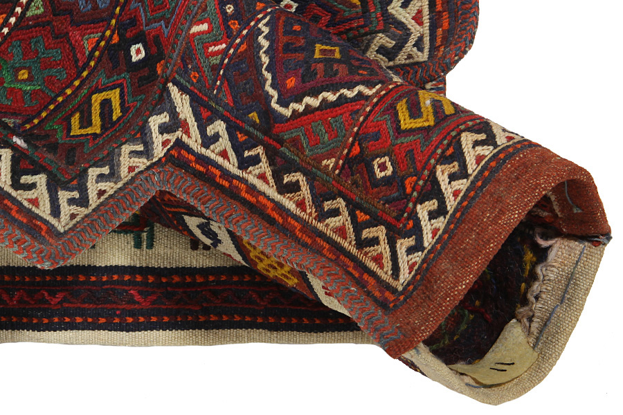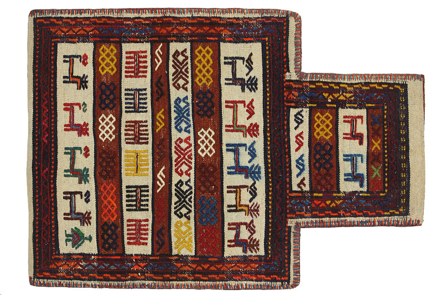Diese Persischen handgeknüpften Satteltaschen werden von den Nomaden für den Eigengebrauch verwendet. Unterscheiden kann man zwischen Kelim-Satteltaschen und geknüpften Satteltaschen. Bei geknüpften Satteltaschen ist die Vorderseite entweder wie ein üblicher Teppich geknüpft oder oder man findet Mischtechniken. Die Seiten werden oft in Knüpftechnik hergestellt, der mittlere Teil in verschiedenen Webtechniken wie zB. Kelim oder Soumak. Die Farben, die für die Satteltaschen verwendet werden, sind Naturfarben und werden von den Nomaden selbst hergestellt. In diesen Satteltaschen wurden einst Güter des täglichen Bedarfs für Reisende auf Esel oder Pferderücken aufbewahrt. Ein entzückendes Kunstwerk, das Ihrem Zuhause eine einzigartige orientalische Atmosphäre bietet. Satteltaschen können mit Kissen gefüllt werden und als Sitzkissen, als Bodenkissen zB. vor Ihrem Kamin oder als Wanddekoration verwendet werden. Kleinere Satteltaschen können über einen Stuhl ode ein Sofa geworfen werden und als Zeitungsständer verwendet werden.