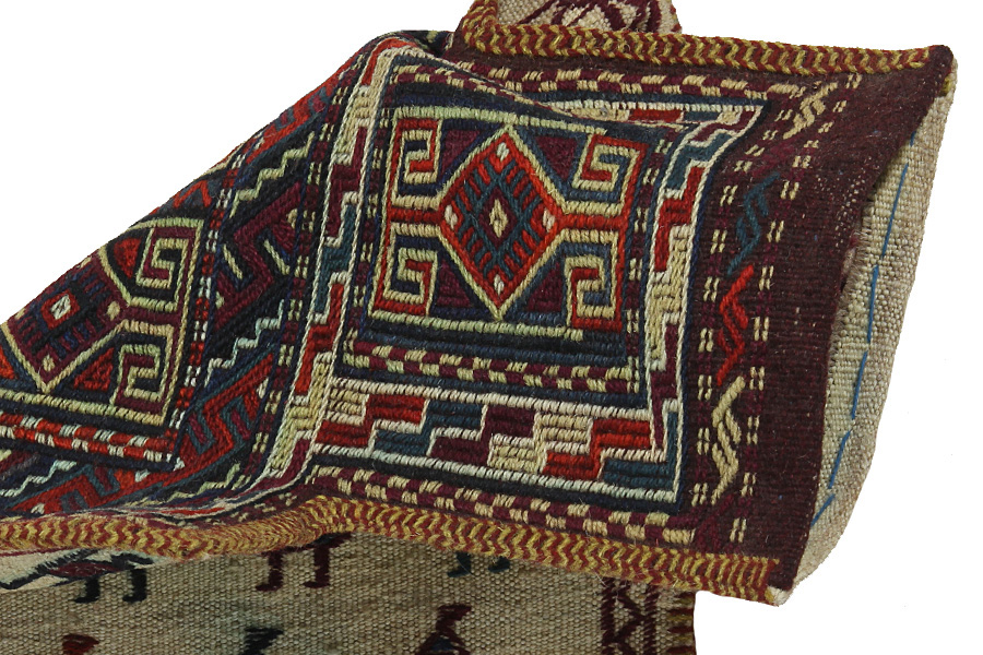Diese Persischen handgeknüpften Satteltaschen werden von den Nomaden für den Eigengebrauch verwendet. Unterscheiden kann man zwischen Kelim-Satteltaschen und geknüpften Satteltaschen. Bei geknüpften Satteltaschen ist die Vorderseite entweder wie ein üblicher Teppich geknüpft oder oder man findet Mischtechniken. Die Seiten werden oft in Knüpftechnik hergestellt, der mittlere Teil in verschiedenen Webtechniken wie zB. Kelim oder Soumak. Die Farben, die für die Satteltaschen verwendet werden, sind Naturfarben und werden von den Nomaden selbst hergestellt. In diesen Satteltaschen wurden einst Güter des täglichen Bedarfs für Reisende auf Esel oder Pferderücken aufbewahrt. Ein entzückendes Kunstwerk, das Ihrem Zuhause eine einzigartige orientalische Atmosphäre bietet. Satteltaschen können mit Kissen gefüllt werden und als Sitzkissen, als Bodenkissen zB. vor Ihrem Kamin oder als Wanddekoration verwendet werden. Kleinere Satteltaschen können über einen Stuhl ode ein Sofa geworfen werden und als Zeitungsständer verwendet werden.